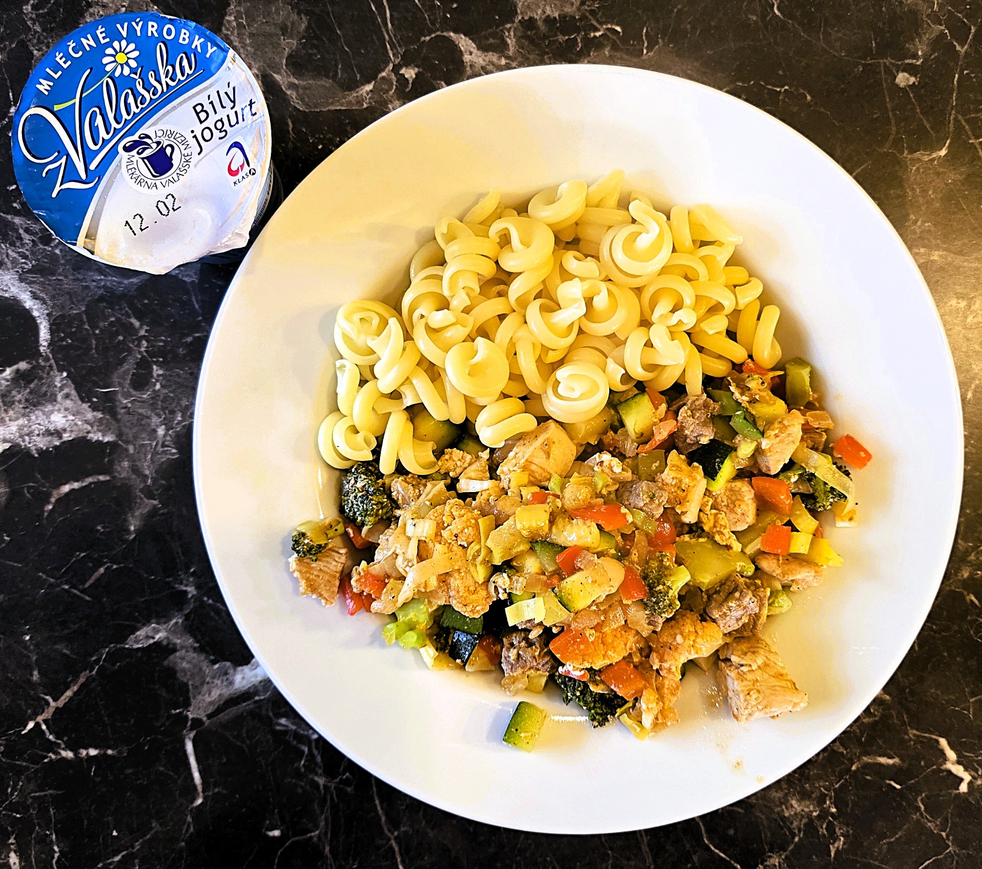 Těstoviny s kuřecí směsí se zeleninou a vajíčkem