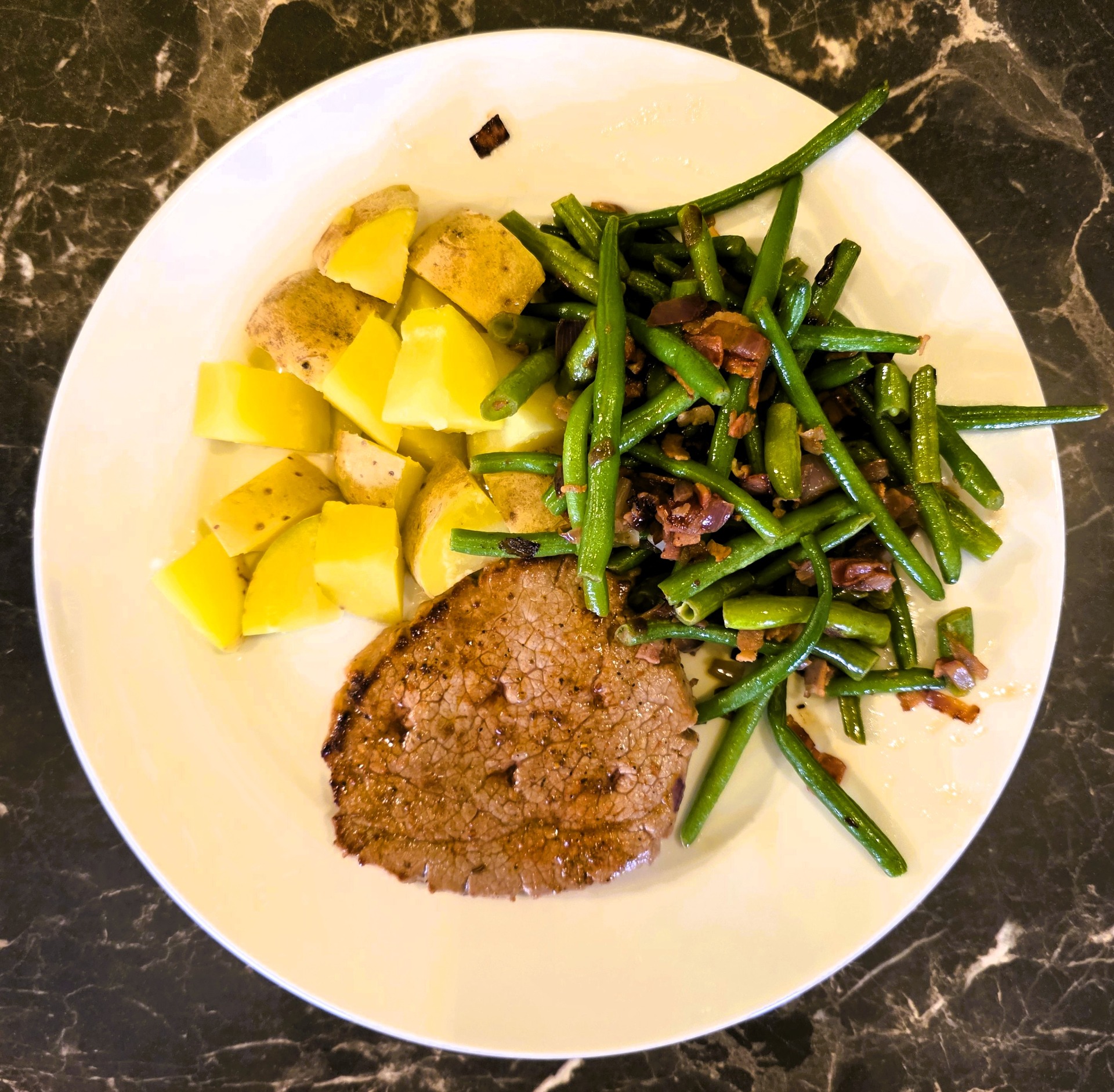 Doba vaření brambor, která se u menších kousků pohybuje kolem 15 až 20 minut, nabízí ideální prostor pro přípravu zbytku menu. Za tu chvíli hravě stihnete šťavnatý steak i restované fazolky na slanině a cibulce.